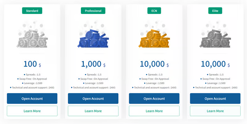 Four types: Basic ($100), Professional ($1,000), ECN ($10,000), and Elite ($10,000) — all with up to 1:500 leverage and similar conditions.