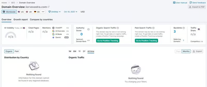 According to analytics data from Semrush, Lorvex Astra’s domain receives virtually zero monthly visits, suggesting no user engagement or organic visibility.