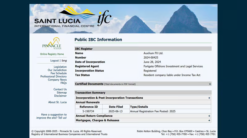 - Entity Check: Visit the Saint Lucia IFC Registry → Search for registration number 2024-00425 → Confirm company name Auxilium FX Ltd.