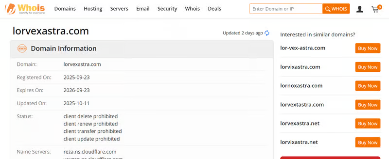 According to public Whois records, the official domain lorvexastra.com was registered on September 23, 2025, and updated on October 11, 2025.