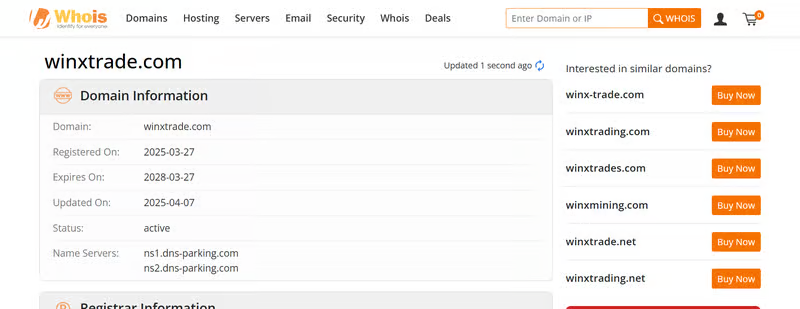 WinXTrade’s official domain, winxtrade.com, was registered on March 27, 2025, with its most recent update on April 7, 2025.