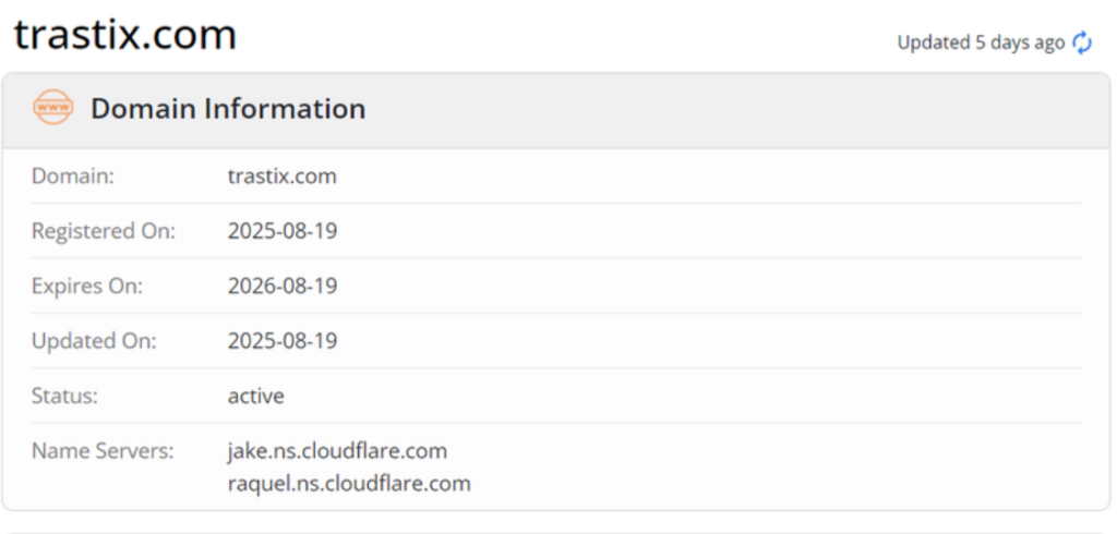 Trastix operates via trastix.com, a domain registered on August 19, 2025, and valid only until August 19, 2026. The registration and last-update dates are identical, showing no ongoing development efforts. Traderknows’ investigation highlights that newly registered domains with such short lifespans often serve as temporary shells, lacking operational history and increasing the likelihood of user risk.