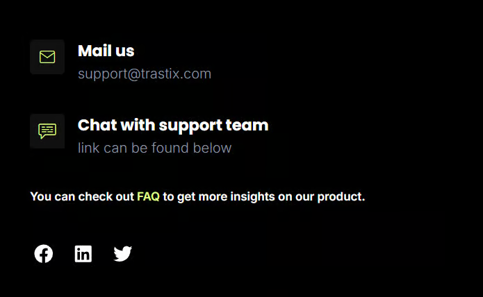 Trastix lists only an email ([email protected]) and a generic chat widget. There is no corporate address, no phone number, and no verified social media accounts. This minimal contact infrastructure is frequently associated with platforms that lack real customer service or operational transparency.
