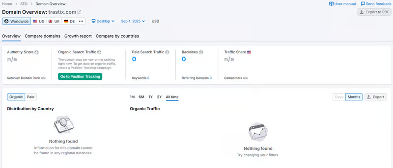 Semrush records show fewer than 100 monthly visits to trastix.com. Traderknows’ coverage highlights the contradiction between this negligible traffic and the platform’s claim of “millions of users,” labeling the statement as misleading.