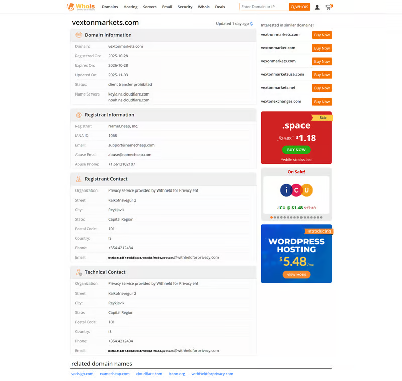 According to publicly accessible WHOIS records, the official website domain vextonmarkets.com shows the following timeline: