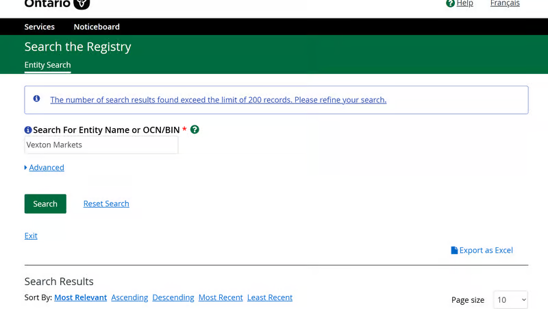 - No matching entity records were found in the Ontario Business Registry (Corporate Register) under the platform’s stated name.