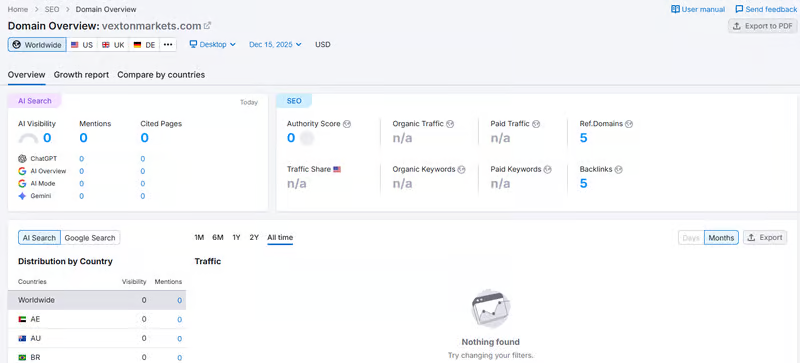 Based on currently available public information, Vexton Markets displays several characteristics of an early-stage or minimally disclosed online trading platform. These include a newly registered domain, lack of verifiable corporate and regulatory records in Canada, minimal online traffic visibility, and limited disclosure regarding trading conditions and operational structure.