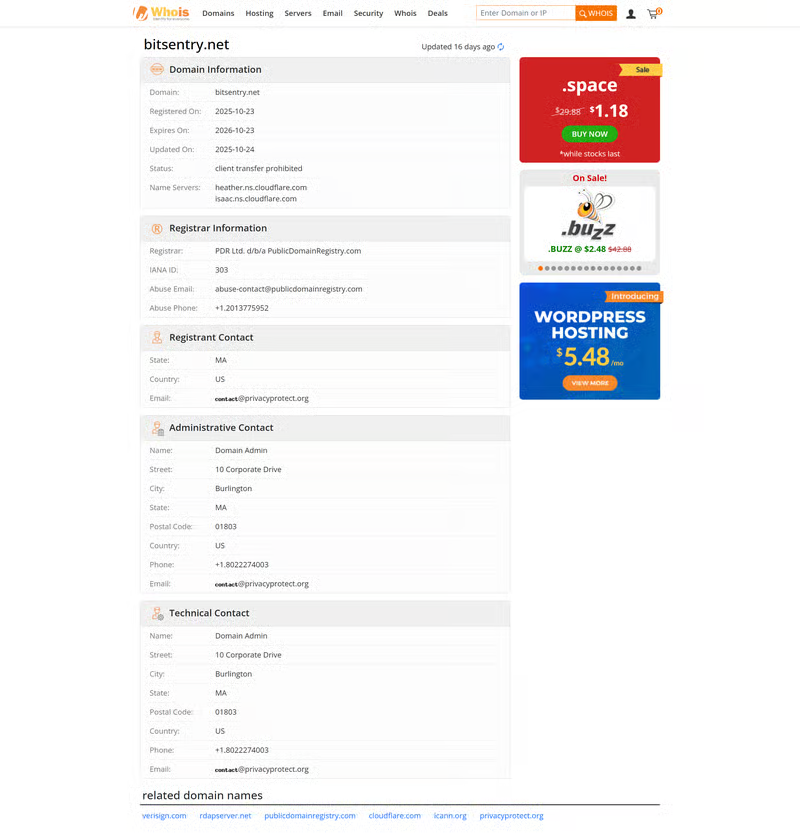 Public Whois data shows that the domain bitsentry.net was registered on October 23, 2025, with an update occurring the following day. From an industry perspective, such a short domain lifespan usually indicates a platform in its earliest operational phase rather than an established trading service.