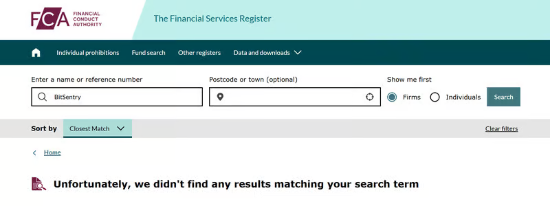 A search of the UK Financial Conduct Authority (FCA) register does not list BitSentry as an authorized or registered entity. Furthermore, the platform does not disclose any regulatory license numbers, supervisory authorities, or cross-border compliance statements on its website.