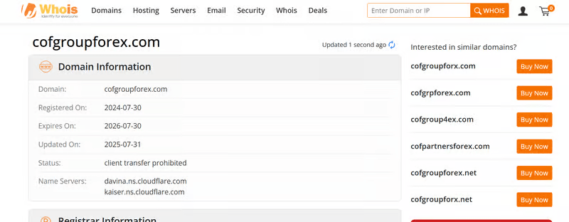 According to Whois results, cofgroupforex.com was registered on July 30, 2024, and updated on July 31, 2025.
