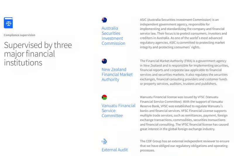 COF states on its website that it is regulated by ASIC in Australia, FMA in New Zealand, and VFSC in Vanuatu. These names carry weight in the retail trading market, particularly ASIC and FMA, which are commonly associated with stricter oversight compared to offshore jurisdictions.