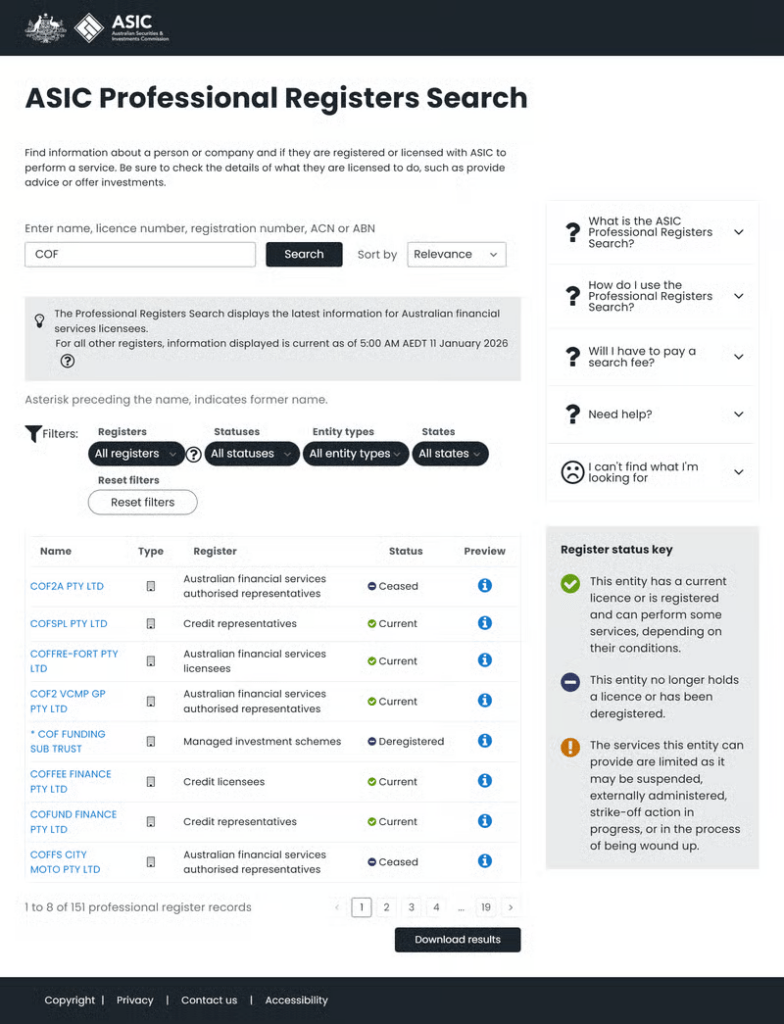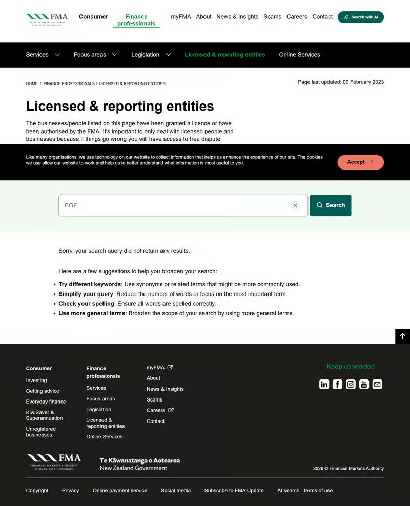 COF claims regulation by ASIC, FMA, and VFSC. However, public verification checks did not find corresponding records in those regulators’ databases at the time of review.