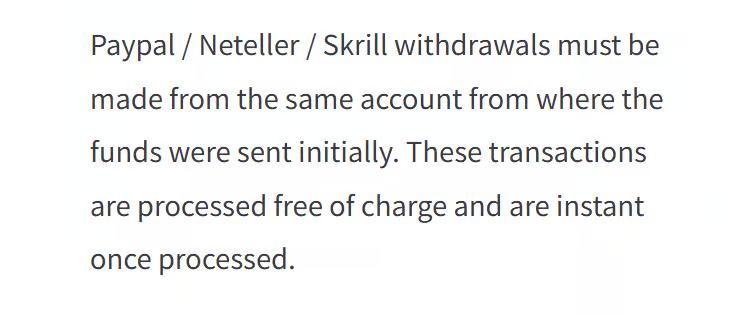 COF lists PayPal, Neteller, and Skrill as supported deposit and withdrawal options. The platform states that withdrawals must be returned to the same account used for the initial deposit, which is a common rule in many payment systems designed to support transaction traceability.