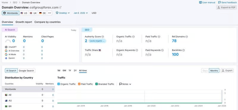 Semrush data shows an estimated average monthly traffic of 0 for cofgroupforex.com. While traffic tools are not perfect and may miss certain private or direct visit patterns, this metric still suggests that the platform currently has limited measurable visibility and reach through public channels.